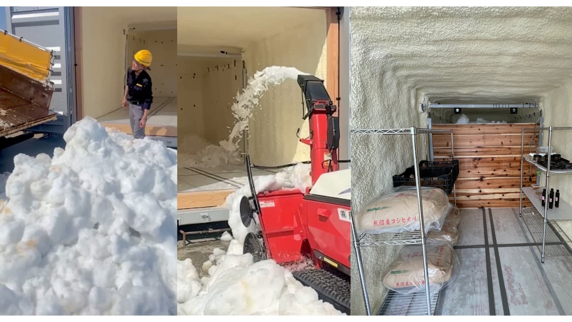 左・中:コンテナに雪を充填 右:食材の熟成実験の様子