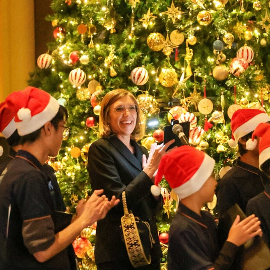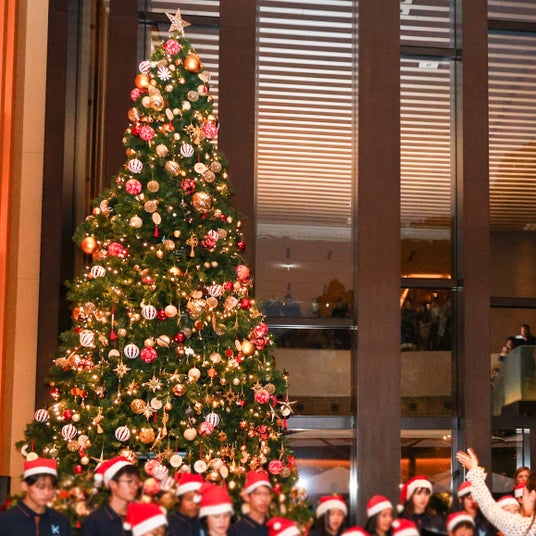 総支配人ファニー・ギブレのスピーチに続き、カウントダウンの合図とともに高さ6メートルのクリスマスツリーが柔らかな光に包まれました。京都インターナショナルスクールのコーラス部によるクリスマスキャロルが響き渡り、ホテル全体が温かな祝福に満ちたひとときに。24名の生徒たちが奏でる美しいハーモニーがエンバラウンジを彩り、フェスティブシーズンの幕開けを祝う特別な瞬間を共有しました。