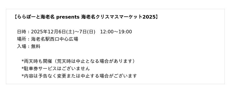 株式会社GRACE(本社:神奈川県横浜市、代表取締役:沢村 優太)が展開するカフェ『UNI COFFEE ROASTERY』は、2025年12月6日(土)・7日(日)の2日間、海老名駅西口中心広場にて開催される「ららぽーと海老名 presents 海老名クリスマスマーケット2025」へ出店いたします。