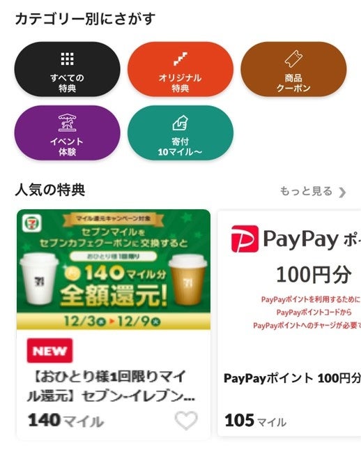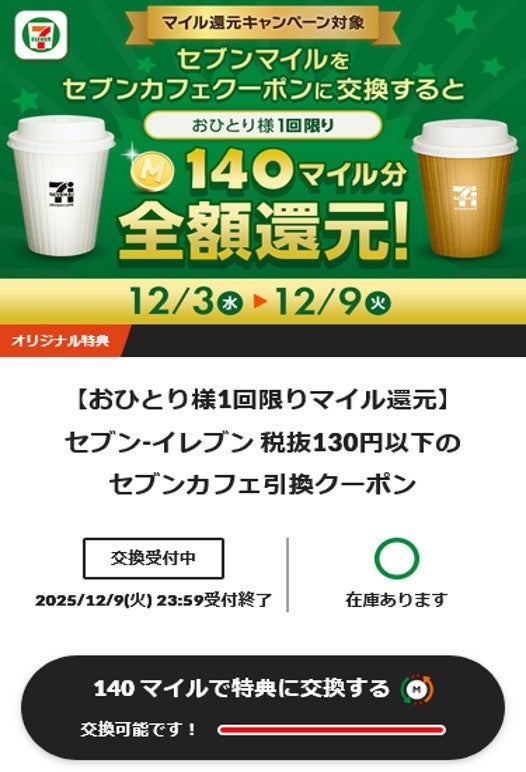 キャンペーン期間中にセブンマイルプログラムで140マイル分を「【おひとり様1回限りマイル還元】セブン-イレブン 税抜130円以下のセブンカフェ引換クーポン」に交換すると、後日140マイルを全額還元します。実施期間: