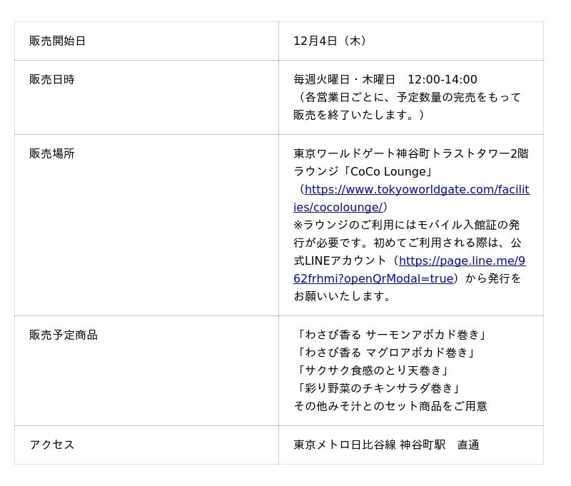 ミツカングループ(以下、ミツカン)とハタプログループ(以下、ハタプロ)が手掛ける寿司ファストフード「NINJA SPEED(TM)」は、麻布台商店街および森トラストグループと連携し、東京ワールドゲート神谷町トラストタワー2階ラウンジにて2025年12月4日より実証販売を開始いたします。本実証販売において、森トラストグループが日本全国の逸品の魅力発信を目的に推進する「CoCo JAPAN」プロジェクトを通じ、香川県の特産品を活かした特別メニューを開発し、期間限定で販売いたします。