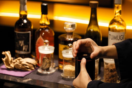 和スピリッツ「TSUMUGI」の麹由来の柔らかな甘みと旨味に、スイートベルモットを合わせシナモンスパイスを効かせたカクテルに、沈香の持つ清涼感と上品なウッディな香りを重ねます。沈香の柔らかい香りがカクテルの甘さとスパイスと調和し、ウィスキーが苦手な方でも香りとの組み合わせを楽しめます。