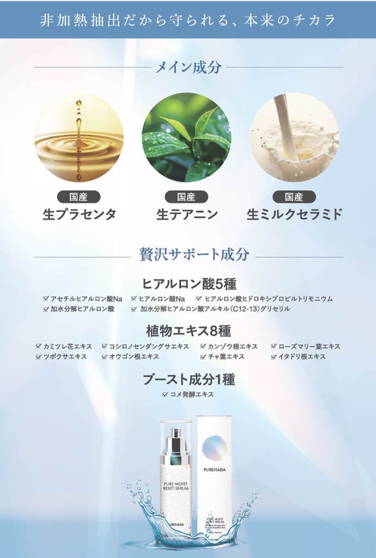PUREHADAが目指す「心まで潤う美しさ」、そして「確かな手応え」という約束を実現するため、成分本来のチカラを最大限に活かす非加熱抽出した成分を採用。