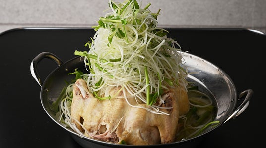 韓国語で「鶏一羽」(「タッ=鶏」「ハンマリ=一羽」)を表す名前の料理で、丸鶏を煮込んで鶏肉とその旨味が溶け出したスープを味わいます。