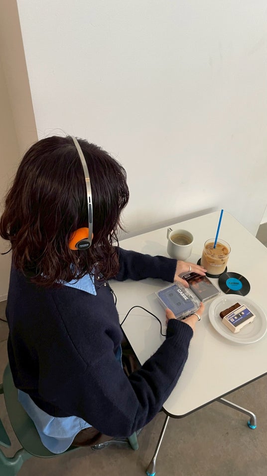 各席でカセットテープを聴きながらドリンクやデザートを楽しめる