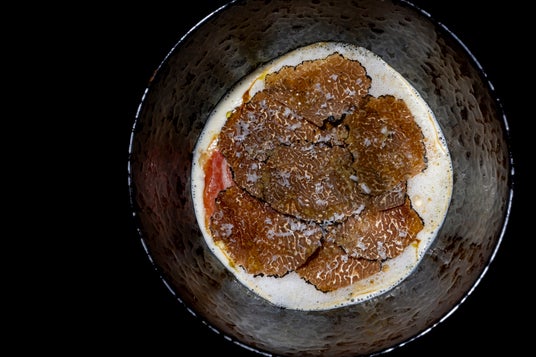 ニョッキの上に生ハム、トリュフを添え、表面を軽く温めることでトリュフの香りを十分に引き出しました。仕上げにトリュフをたっぷり使ったソース・ペリグーをかけて。