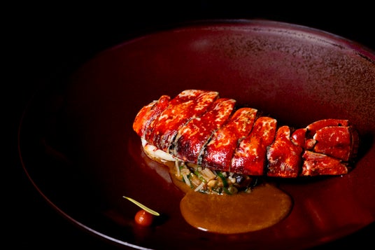オマール海老はバターでゆっくりとコンフィのように旨みを閉じ込め、最後に藁で香りを纏わせ高温で仕上げます。