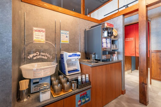 自分で作る楽しさを。お子様に大人気のわた菓子機やソフトクリーム、ドリンクバーも完備。