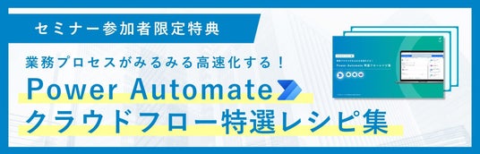 本セミナーの参加者限定で、Power Automate クラウドフローの構築手順がわかるPDFガイド『Power Automate 特選フローレシピ集』を配布いたします。