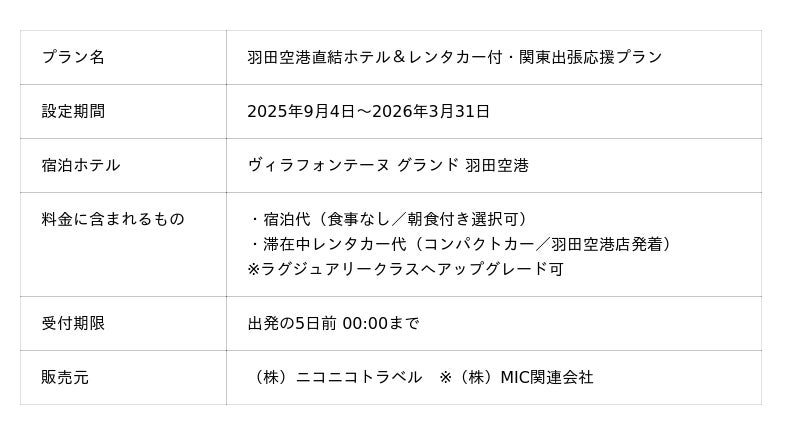 株式会社MIC(本社:神奈川県横浜市、代表取締役:増田信夫)は、羽田空港直結の「ホテル ヴィラフォンテーヌ グランド 羽田空港」と「ニコニコレンタカー羽田空港店」を組み合わせた宿泊・レンタカーセットプランの販売を開始しました。