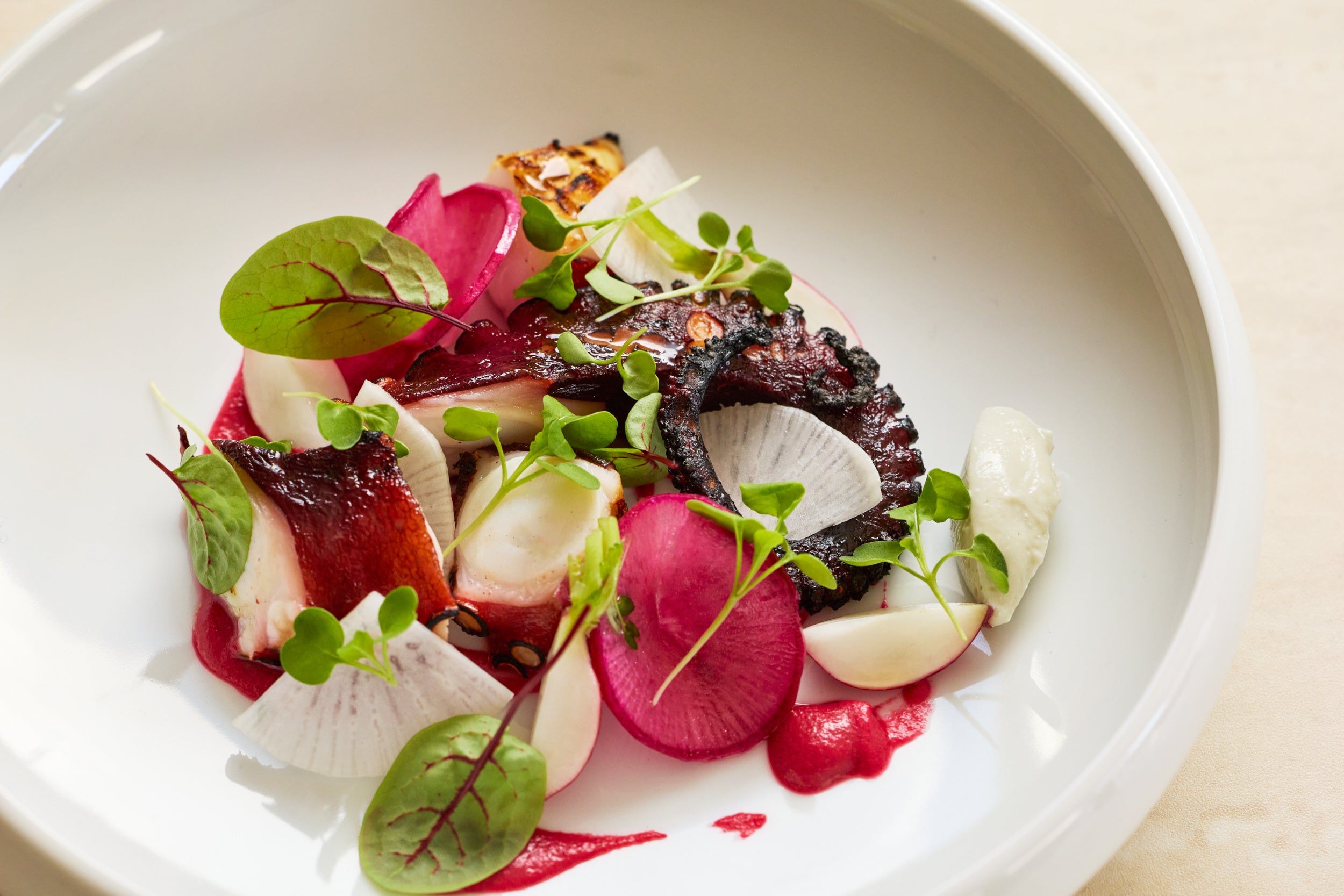 炭焼きタコのコンフィ ラディッシュのピクルスとゴルゴンゾーラ風味の麹チーズを添えて 2,500 円