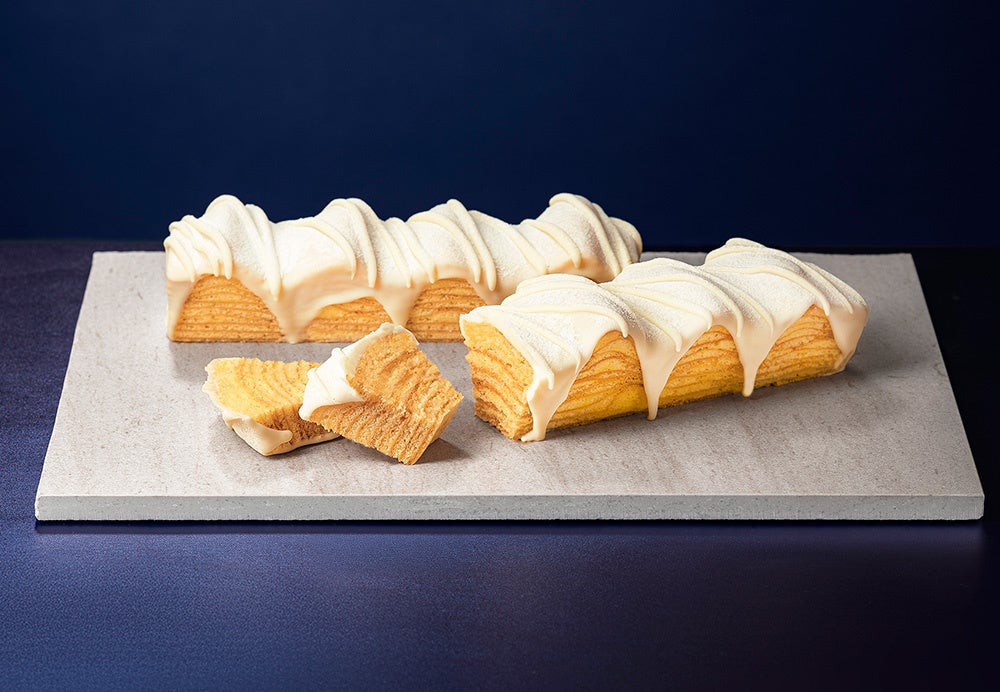 雪のように口どける、冬仕立ての『雪?のマウントバーム』。濃厚バター風味の代表作『マウントバーム しっかり芽』に、北海道ミルクの味わいを溶け込ませたホワイトショコラをとろりと流しかけました。長時間かけてじっくりと焼きあげた生地は、外はカリッと香ばしく、中はしっとり熟成。バターのコクとミルクの香りが口の中でとろけあう、至福の美味しさです。