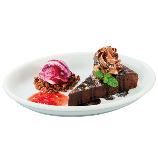 期間限定のデザート「クリスマスケーキ」は、しっとり濃厚なチョコレートケーキにベルギー産のクーベルチュールチョコレートを使用したホイップ、チョコレートソース、金粉をトッピングした一品です。プレートを彩る、爽やかな酸味が特長のカシスアイスやいちごソースとご一緒にお召し上がりください。