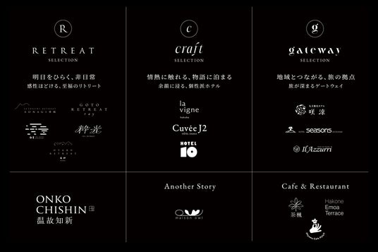 旅の目的地となる宿(=デスティネーションホテル)をプロデュースする株式会社温故知新(本社:東京都新宿区、代表取締役:松山 知樹)は、全施設を対象に、新たなブランドカテゴリー「RETREAT SELECTION / CRAFT SELECTION / GATEWAY SELECTION / ANOTHER STORY / CAFE & RESTAURANT」を正式導入いたしました。旅行の目的が多様化するなか、お客様が旅の目的に合った施設をより選びやすくすること、そして今後予定されている新規開業に向けてブランド体系を整理することを目的としています。