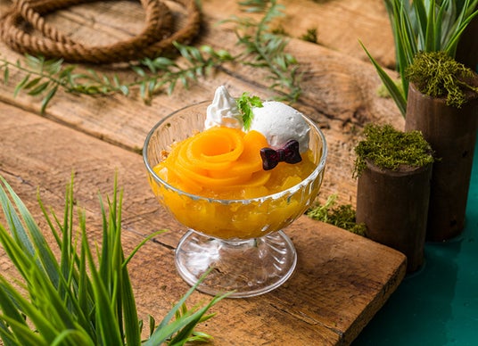 タキシードとドレスを着てズーテニアル・ガラに潜入するニックとジュディをイメージしたパフェ。