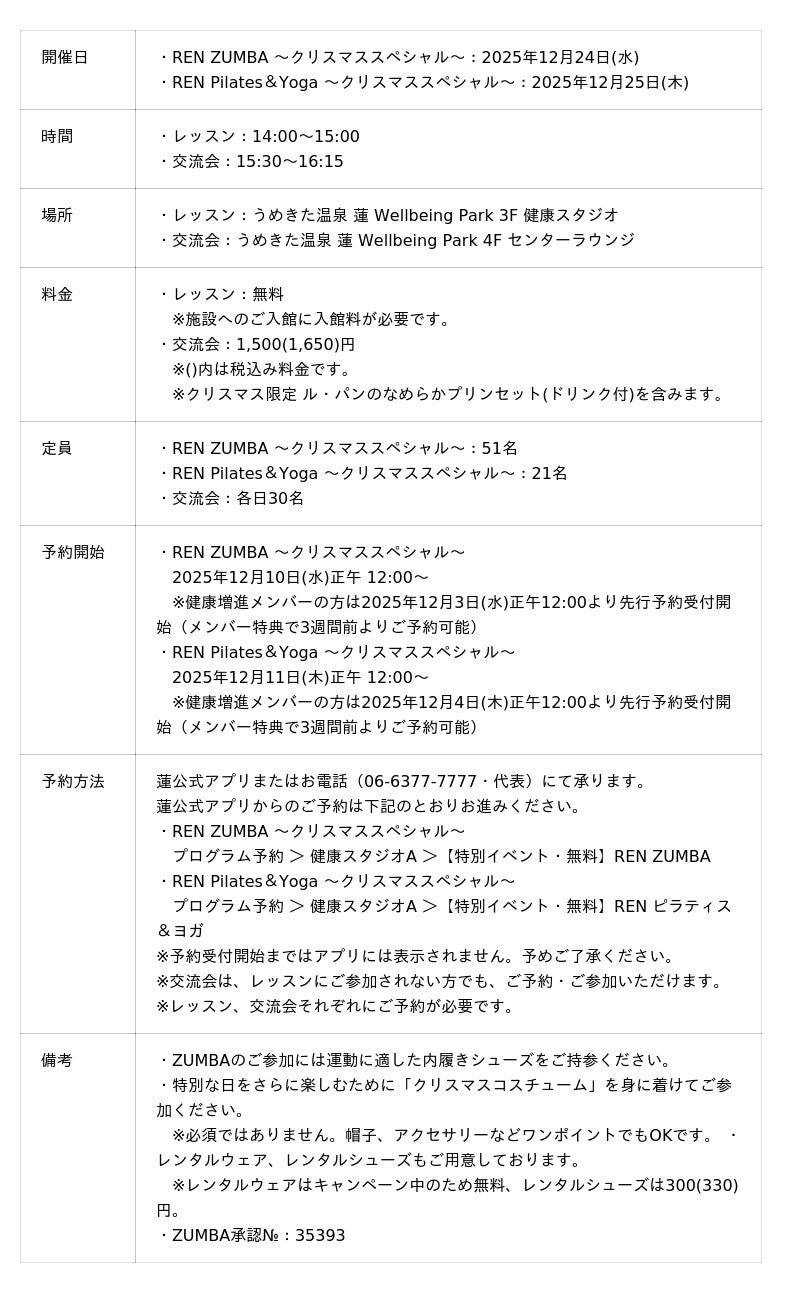 「うめきた温泉 蓮 Wellbeing Park」(総支配人:藤立 達哉、所在地:大阪市)では、2025年12月24日・25日に人気インストラクターによる特別イベント「REN CHRISTMAS SPECIAL LESSON」 を開催することをお知らせします。