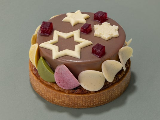 口どけ滑らかなババロワキャラメルと濃厚なクレムーキャラメルを重ねて仕立てたクリスマス限定のキャラメルケーキ。テクスチャーの異なる2層が織り成す深いキャラメルの味わいに、香ばしいヘーゼルナッツの風味とサクサクとした歯応えがバランスよく調和しています。艶やかなグラサージュの上には、オリジナルビターチョコレートで作ったボールとヒイラギを飾りました。