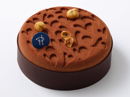 チョコレートとヘーゼルナッツが、クラシカルかつマジカルな形で融合。チョコレートビスキュイのふんわり感、ヘーゼルナッツプラリネクリームのとろり感、さらにビターチョコレートガナッシュのなめらかさが、コントラストの妙を示しながらすみ分けています。まさに力強さと甘美さが戯れる逸品です。