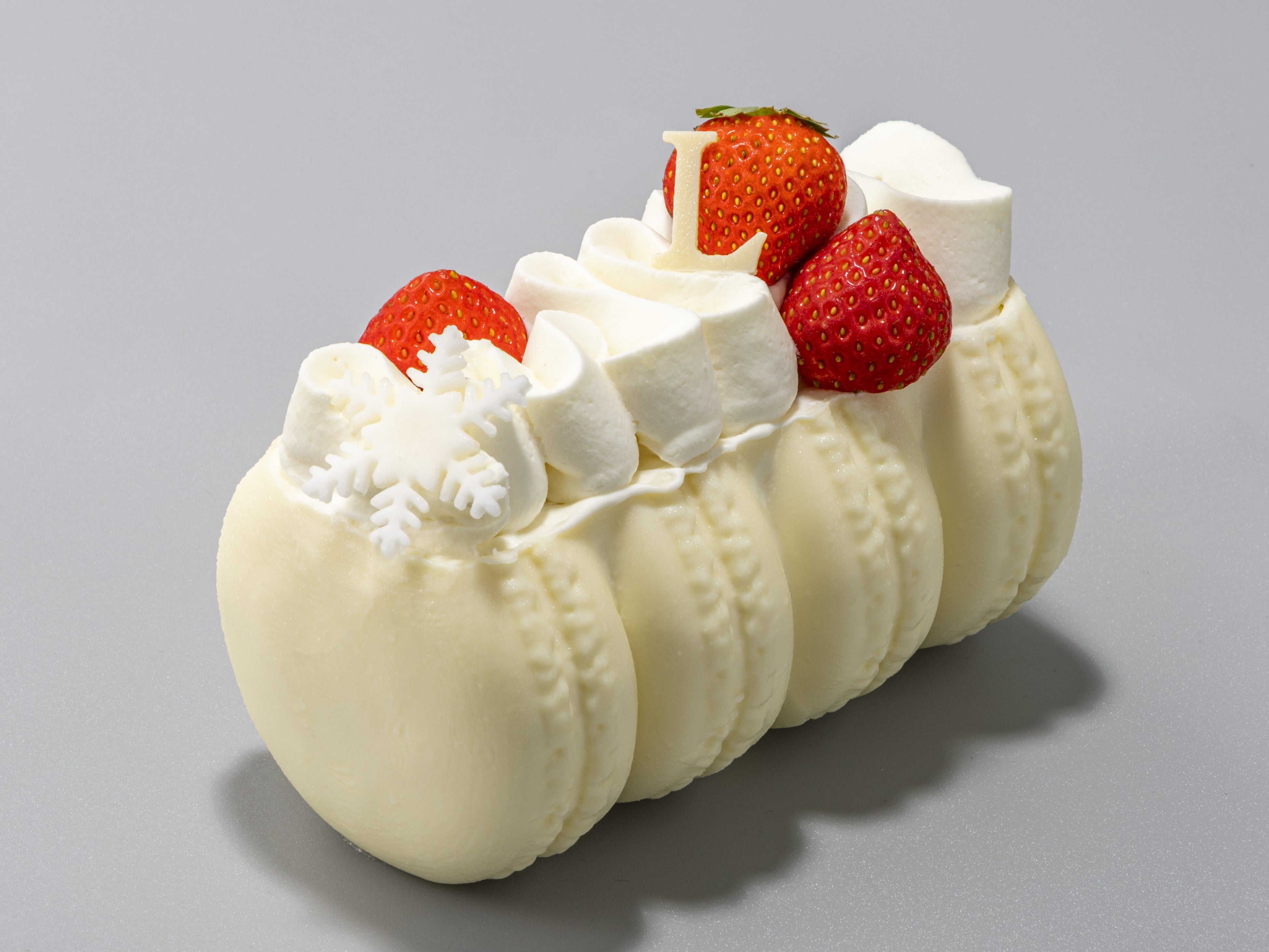 マカロンが4つ連なっているかのような佇まいのビュッシュ・ド・ノエルに、苺のショートケーキが登場。ジェノワーズ生地にバニラ香るガナッシュ・モンテと、苺のクーリを重ね、ホワイトチョコレートで包みました。たっぷりのガナッシュ・モンテと雪の結晶やL字のホワイトチョコレート、苺のデコレーションをあしらい華やかに仕上げました。クリスマス限定ショッパー付きです。