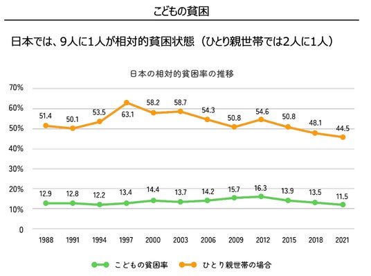 厚生労働省「国民生活基礎調査」によると、日本では9人に1人のこどもが、ほとんどの人が当たり前に享受している生活が送れない”相対的貧困”状態と言われており、ひとり親世帯では2人に1人と言われています。