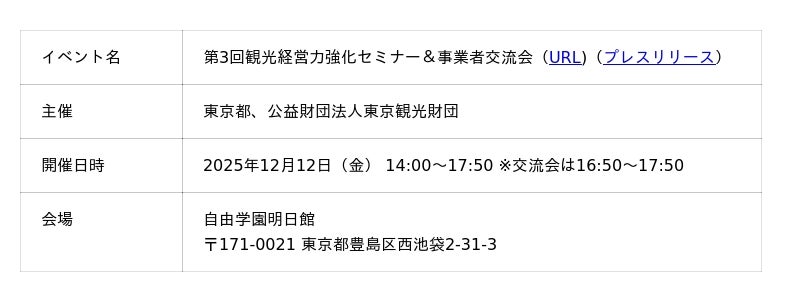 合同会社アイリスブレイン(本社:東京都中央区、代表:森 健人)は、2025年12月12日(金)に開催される東京都と公益財団法人東京観光財団主催「第3回観光経営力強化セミナー&事業者交流会」の第3部事業者交流会にブース出展いたします。