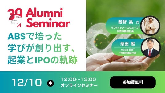 株式会社Aoba-BBTは、グループ横断で推進する「周年プロジェクト」の幕開けを飾る象徴的な企画として、創立30周年を迎えるアタッカーズ・ビジネススクール(ABS)の卒業生・越智晶氏(株式会社リファインバースグループ 代表取締役社長)を迎え、当社代表・柴田巌との特別対談を開催いたします。