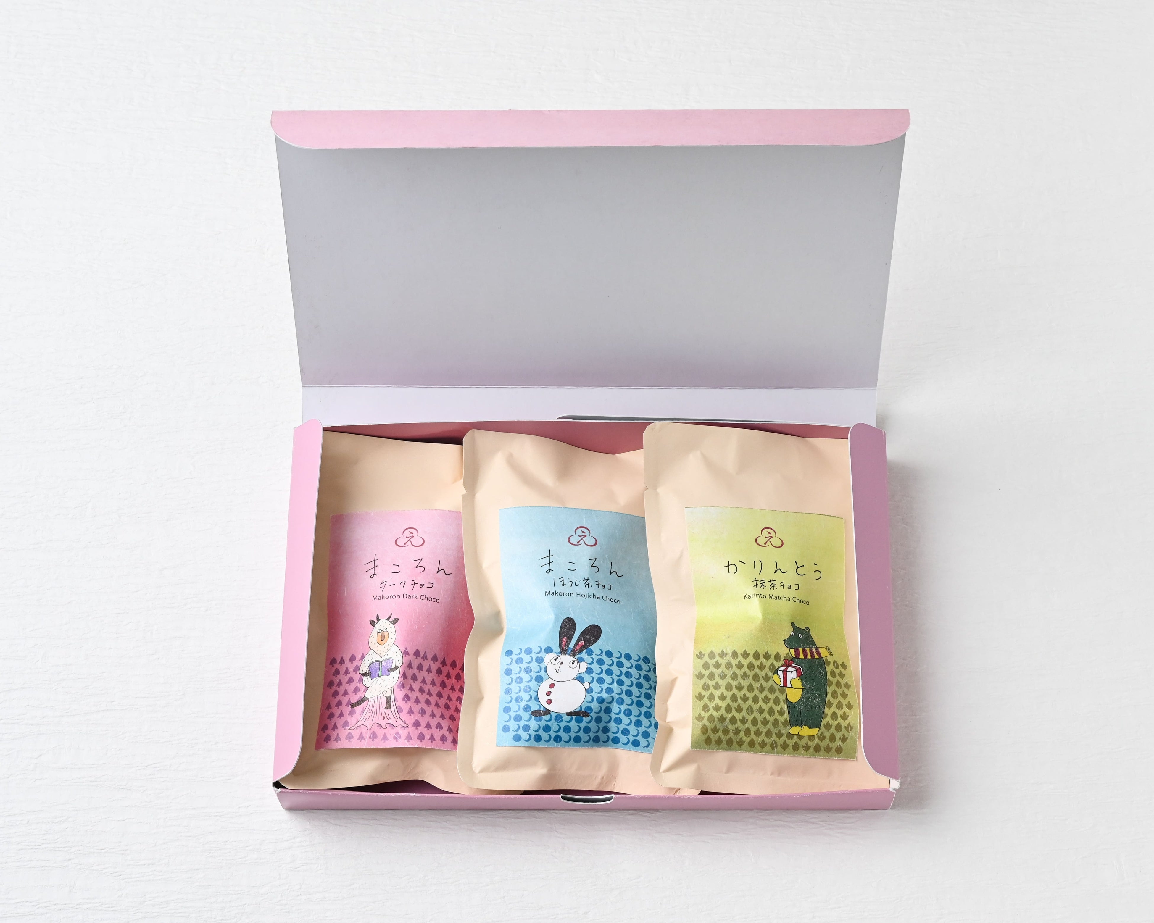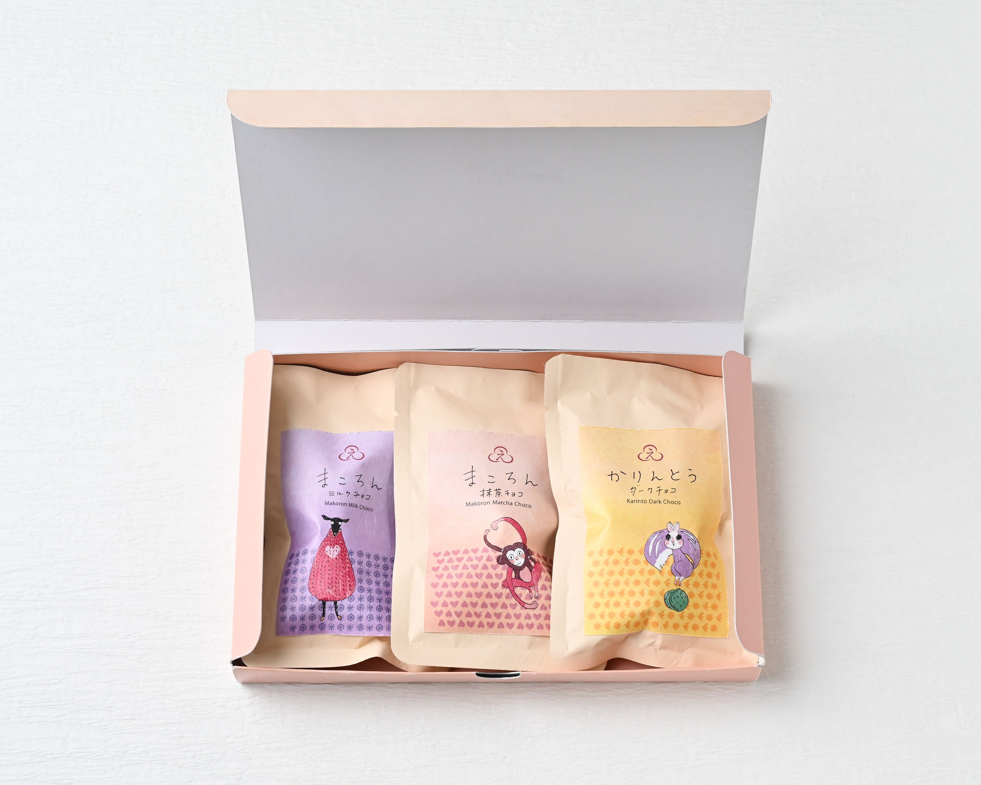 まころんミルクチョコ・まころん抹茶チョコ・かりんとうダークチョコの3種入り。