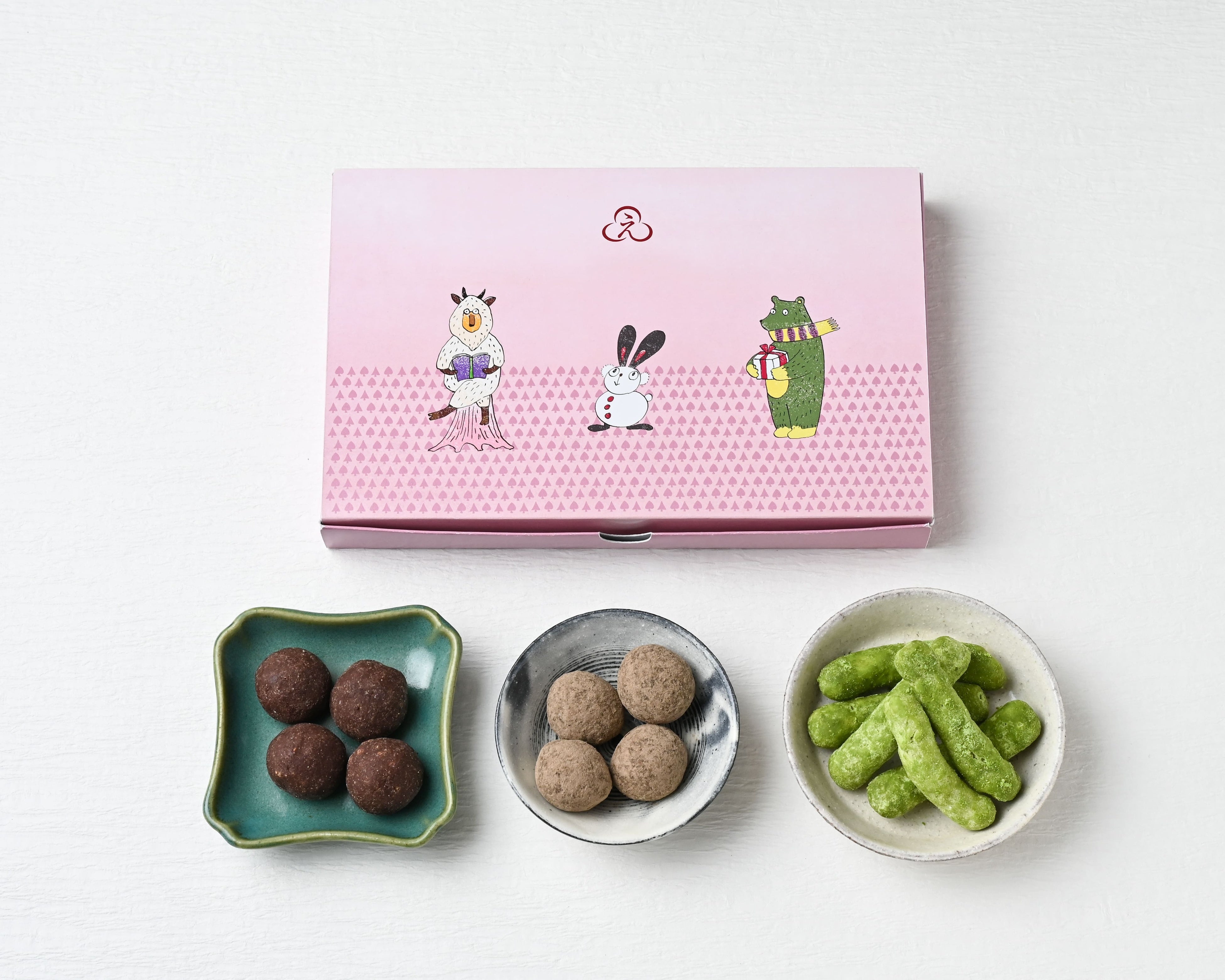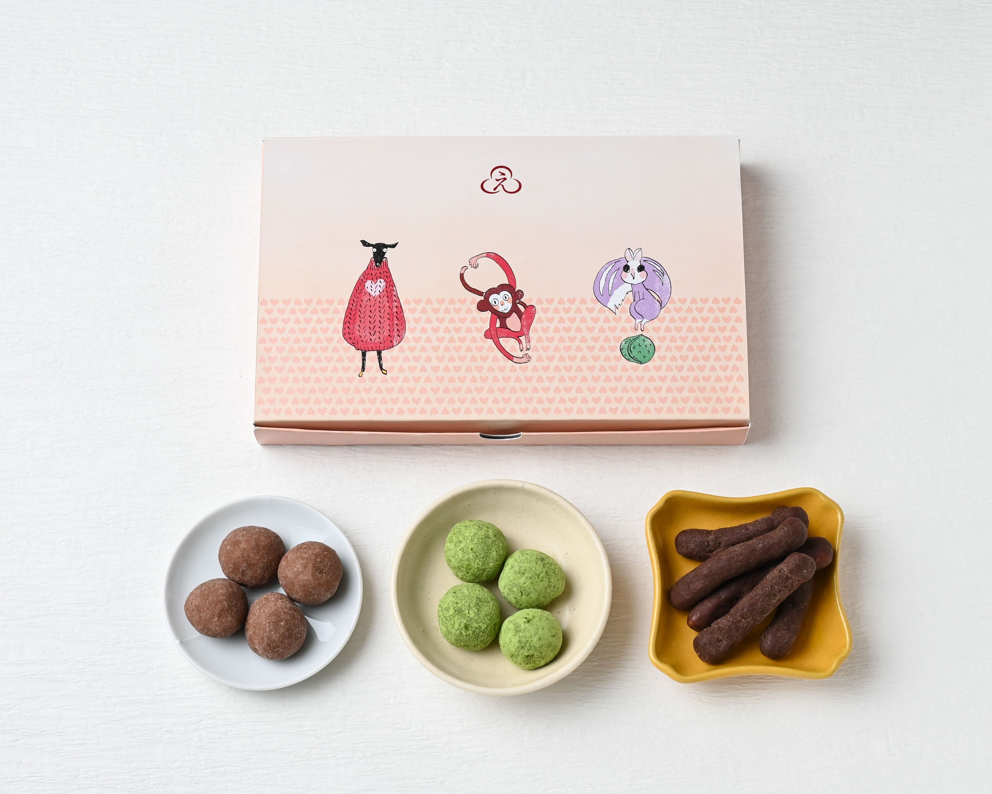 まころんダークチョコ・まころんほうじ茶チョコ・かりんとう抹茶チョコの3種入り。