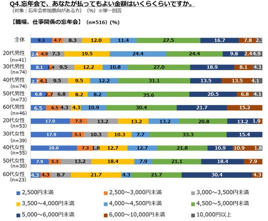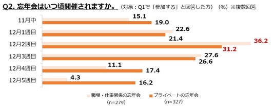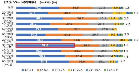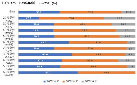 今年の忘年会は、職場・プライベートともに半数以上の参加意向がありました。 忘年会で、何次会まで参加するか尋ねると、職場は「1次会まで」が60%なのに対し、プライベートでは35%にとどまり、職場はスマートにサッと、プライベートは2次会、3次会と長い夜を楽しむという、シーンに合わせたメリハリのある楽しみ方をされる方が多い様子がうかがえました。
