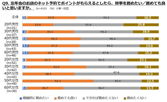 忘年会の幹事を頼まれたらどうするか尋ねると、40代男性では全体より約10ポイント高い35%が「喜んで引き受ける」と回答。50代男性でも33%と、やや高くなりました。忘年会の幹事としてのネット予約の利用意向は96%と、忘年会とネット予約は切っても切れない関係にありそうです。そのメリットとしてあげられるのはやはり「ポイントが貯まる」という点。 「ポイントが貯まる」ことで、幹事を頑張りたいと思ってくれる人がいるのは、「出来れば断りたい」「絶対に断る」という方から見るとありがたい存在かもしれません。