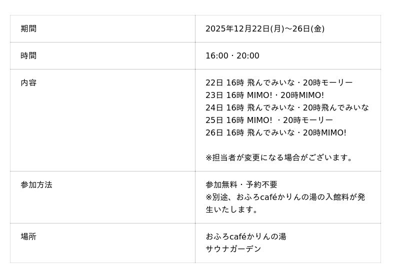 ”サウナ納め”クリスマス・年越し・SPゲスト”オカミチオ”おふろcafeかりんの湯が12月限定アウフグースイベントを一挙開催