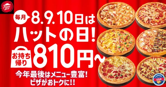 日本ピザハット株式会社(代表取締役会長兼社長:深瀬 成利、本社:神奈川県横浜市、以下:ピザハット)が展開する世界最大級のピザチェーン「ピザハット」は、毎月8日・9日・10日を「ハットの日」として、ピザハットの商品をお持ち帰り810円~でご提供するキャンペーンを実施しております。