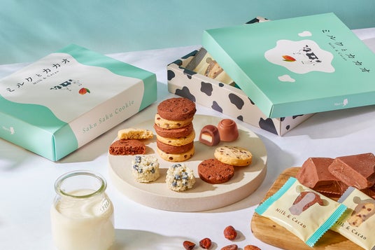 コク深くまろやかな甘みが特長の北海道ミルクと、チョコレート屋さんのこだわりが詰まったカカオでつくりあげたスイーツブランド「ミルクとカカオ」。ふたつの味わいのハーモニーをより手軽にお楽しみいただけるよう、クッキーやクランチとなって新しく生まれ変わりました。また、爽やかな白とミントグリーンを基調としたパッケージが、テーブルシーンを明るく彩り、楽しいおやつ時間を演出します。心温まるお手土産にもおすすめです。