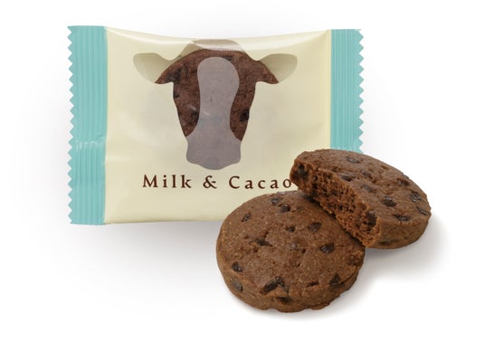 カカオ感の強いココア生地のクッキーに、スイートチョコレートのチョコチップを合わせました。生地に北海道産牛乳を使用した、カカオとミルクの味わい。