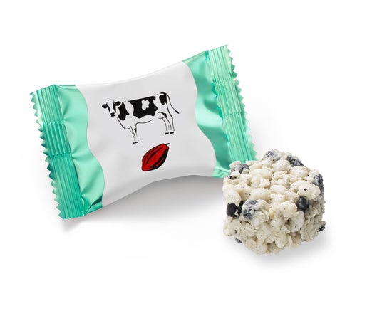 さくさくとした食感のお米のパフと砕いたクレープ生地に、北海道産全粉乳入りのホワイトチョコレートを絡めました。食感と味わいのアクセントにブラックココアクッキーを合わせました。