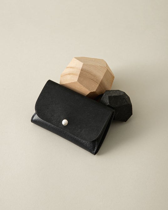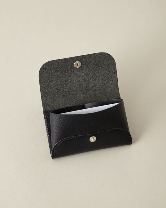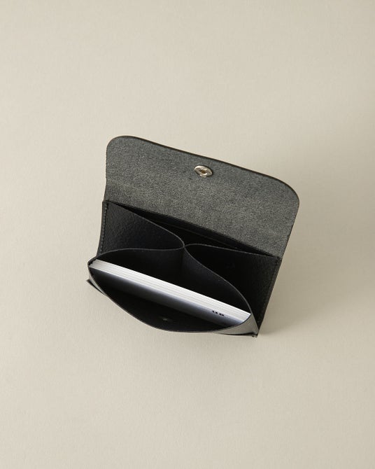 本体のポケット部分は、蛇腹(じゃばら)構造を採用。フラップを開けるとポケット部分が自然に手前に広がる設計で、ストレスなくスムーズにカードを取り出すことができます。手前のメインポケットには、名刺で約25枚の収納が可能です。日々の使いやすさにも拘ったアイテムです。