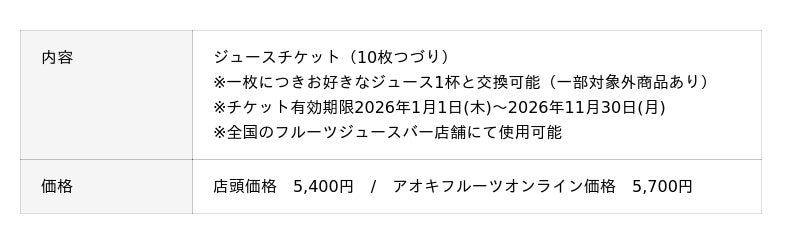 ■『福袋(ジュースチケット)』 チケット1枚につき、お好きなジュース1杯と交換できる人気のチケットを今年も販売します(一部対象外商品あり)。サイズ・金額を問わず、すべてのジュースを実質540円で飲むことができるチケットで、いつもより大きめのサイズを選んだり、新しいメニューや高額商品に挑戦したりしてお楽しみいただけます。また、本チケットは当社ECサイト「アオキフルーツオンライン」でも販売いたします。年始当日に店舗へ足を運ぶことが難しい方でも、ご自宅にてチケットを受け取ることができます。