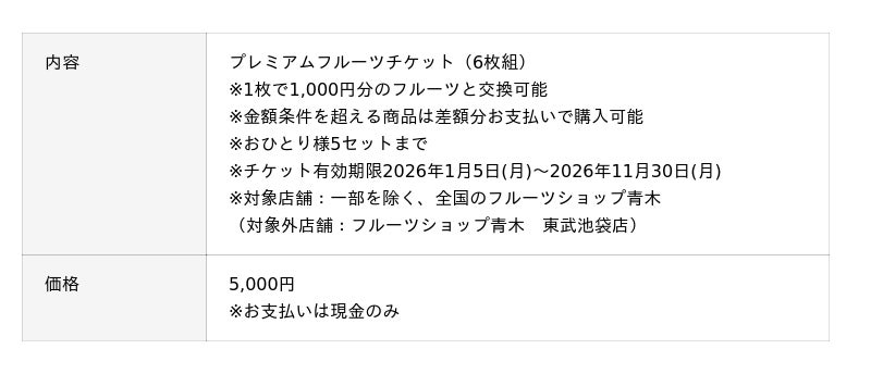 ■『プレミアムフルーツチケット』 フルーツマイスター厳選のフルーツを1枚で1,000円分と交換できるチケットをご用意しました。1セット5,000円でチケットが6枚ついてくるため、実質1,000円分お得にフルーツを購入いただけます。店頭に並ぶすべてのフルーツからお好きな商品と交換できるため、お気に入りのフルーツや、まだ挑戦したことのないフルーツなど、季節ごとに変わるフルーツを楽しみながら選んでいただけます。