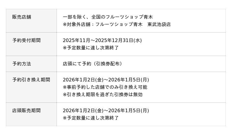 青木フルーツ株式会社(本社:福島県郡山市、代表取締役社長:青木大輔、以下当社)は、2026年の新年を彩る「福袋」を、当社が運営するフルーツジュース専門店「果汁工房果琳」、フルーツタルト&カフェ専門店「フルーツピークス」、フルーツ専門店「フルーツショップ青木」の3ブランドにて販売いたします。