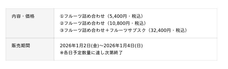 今年のテーマは「フレ!フレ!フルーツ生活!」です。当社は“フルーツ文化創造企業”として、フルーツを日常的に楽しむ暮らしの実現を目指して事業を展開しています。長く続く物価高の中でも「もっと気軽に、もっとおいしくフルーツを味わってほしい」という想いを込め、このテーマを掲げました。各ブランドならではのお得で特別な福袋を通じて、フルーツが主役の豊かな日常をお届けします。