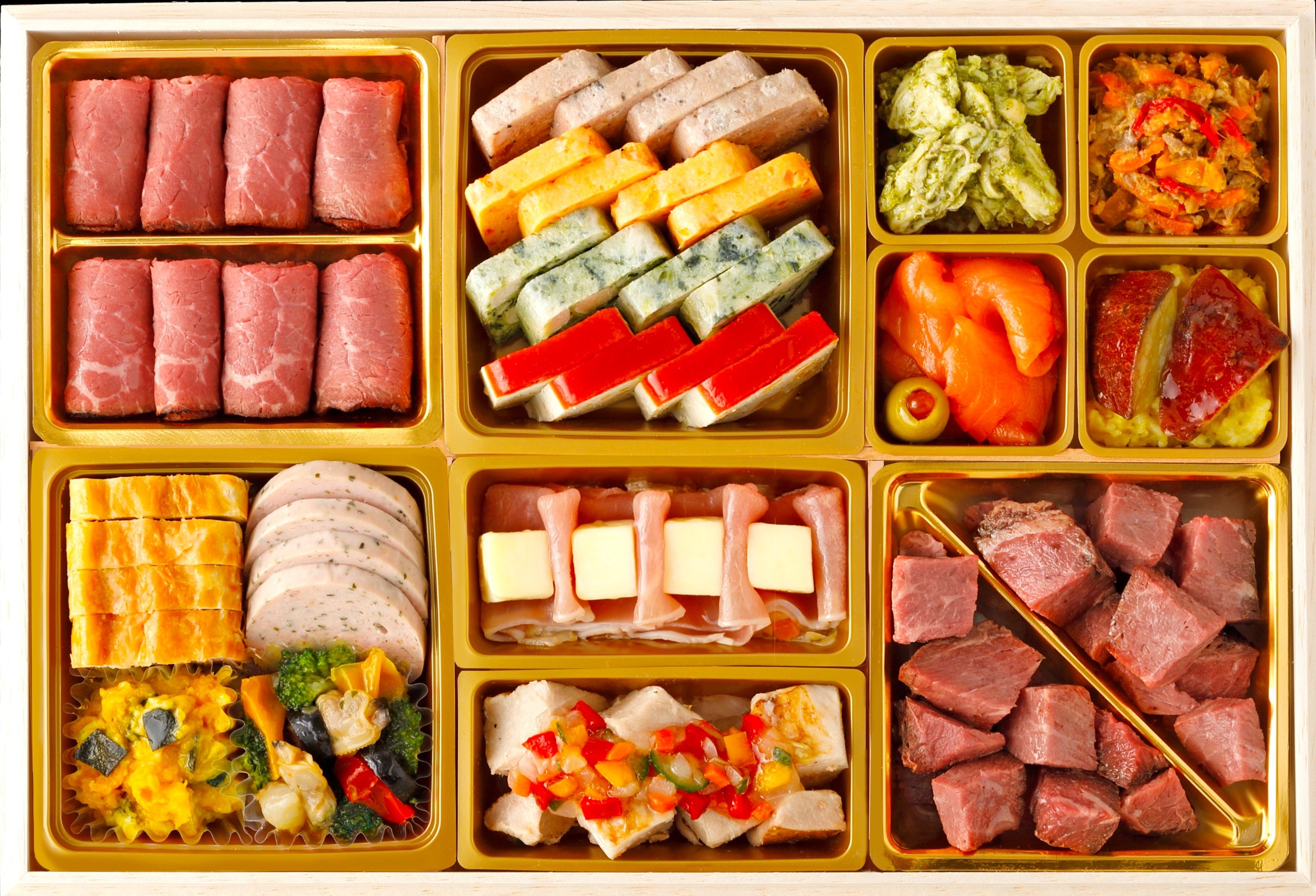 ローストビーフやハムなど、ローマイヤが自信を持ってお届けする肉料理を豊富にラインアップ。さらに海老やスモークサーモンなどの魚料理、マリネ・サラダ・デザートまで揃え、お子さまから大人まで、世代を問わずお楽しみいただけます。