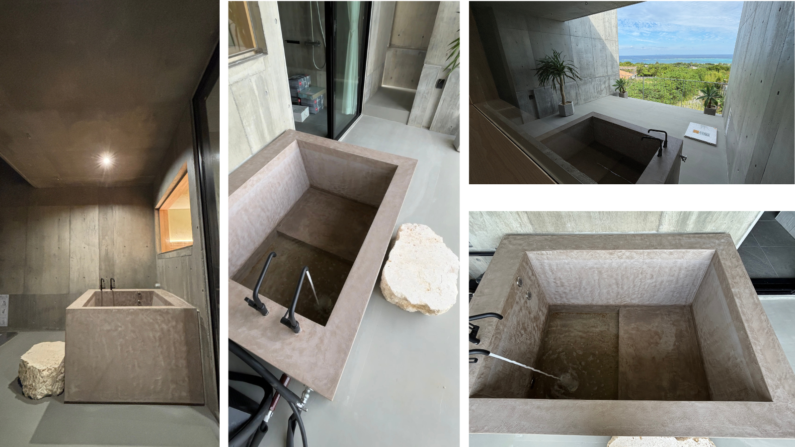 モールテック製の造作水風呂と琉球石灰岩の踏み台。
