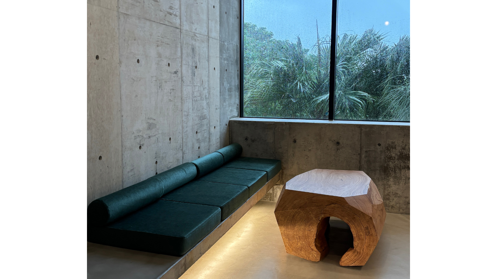 宿の目玉は、沖縄県産木材「センダン」の大木を利用したテーブルです。