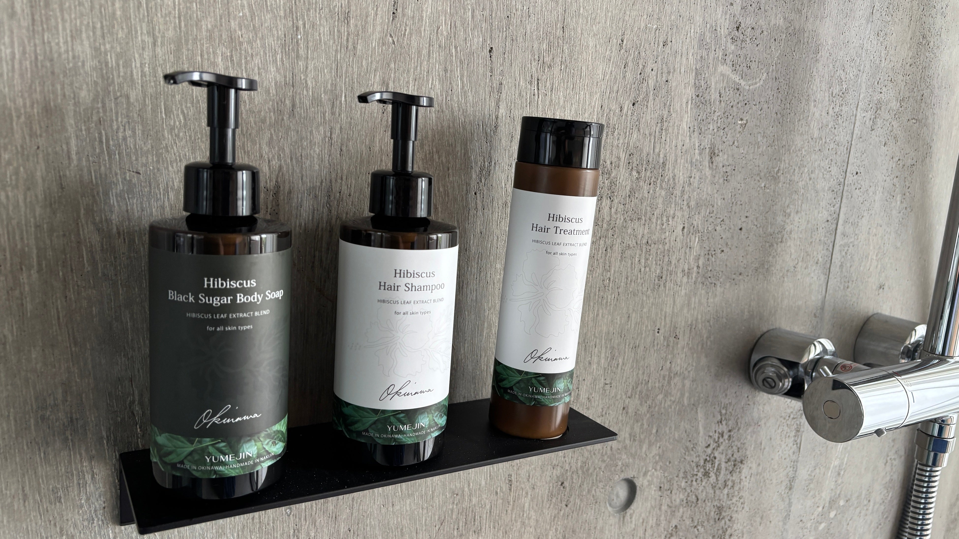 その他、沖縄の土を使った漆喰「レキオライム」を寝室の天井に使用していたり、沖縄県産マットレス、「YUMEJIN」さんの無農薬沖縄県産ハイビスカスシャンプーなどを設置しています。