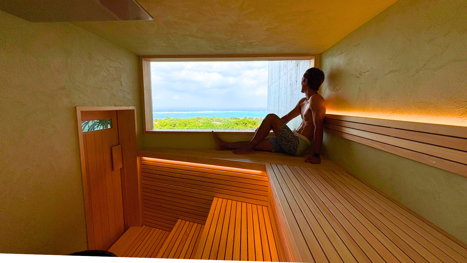 大開口の窓からのオーシャンビューフィンランド式サウナ。ベンチはヒノキ作りで香りが広がります。
