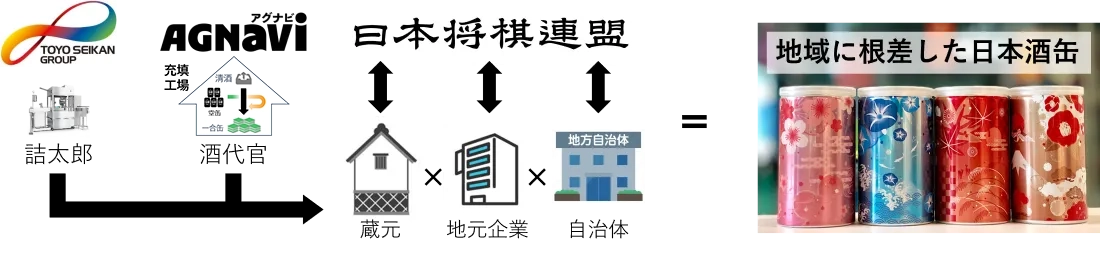 本プロジェクトは、各地域の酒蔵でつくった日本酒を一合サイズのアルミ缶に詰め、将棋の棋戦や地域におけるイベントを記念したオリジナル日本酒缶を製作することで、来場者および地域の方の交流の促進や、お土産として楽しんでいただくための充填サービスとなります。東洋製罐グループの保有する移動式日本酒缶充填サービス「詰太郎」を利用し、地場の蔵元に充填機をレンタルする方式、もしくはAgnaviの展開する委託充填サービス「酒代官」で、タンクに充填したお酒を送ることで缶に充填する方式をご利用いただけます。