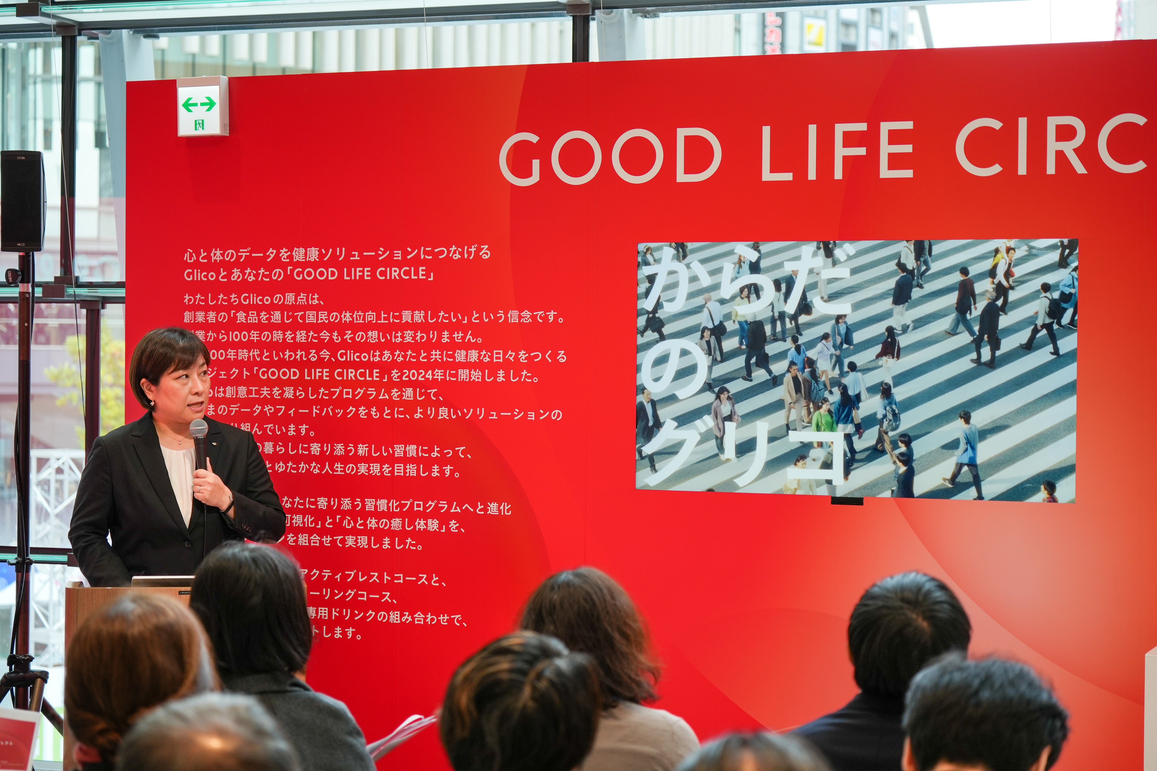 はじめに、江崎グリコ 社長室コーポレートブランディンググループ長 三木依子より、「GOOD LIFE CIRCLE」プロジェクトの取り組みについてご説明。また12月4日(水)より全国放映が開始した新企業広告(CM)『GOOD LIFE CIRCLE 「からだはデータでできている」篇』※の先行公開を行いました。