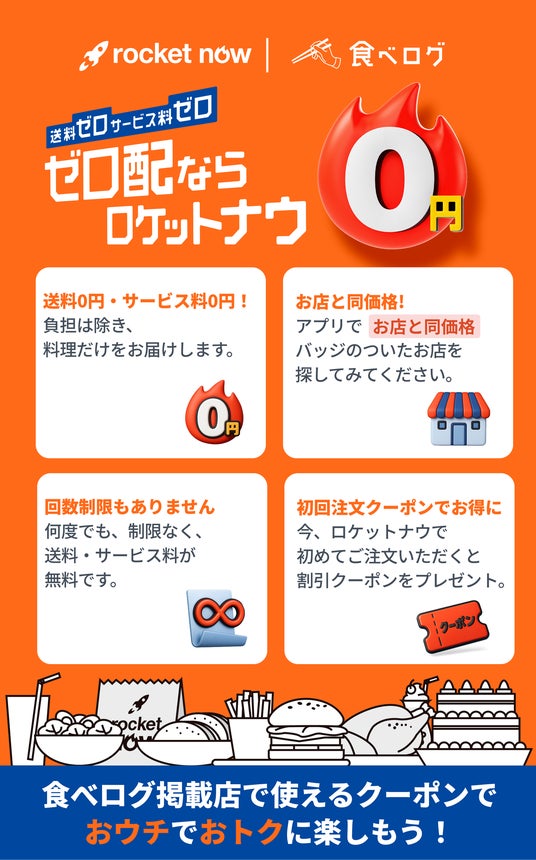 食べログの豊富な掲載店舗と、ロケットナウの送料・サービス料無料のフードデリバリー体験を組み合わせることで、食の出会いとお得さを兼ね備えた新たな食体験をお届けします。今後も食べログとのタイアップを通じ、より便利で価値あるサービスを展開してまいります。