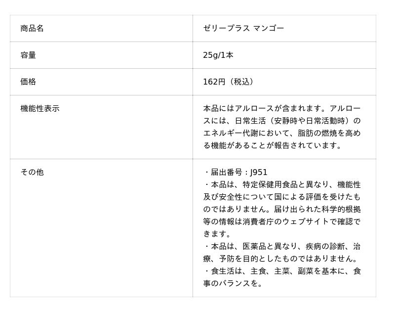 本商品は、日常生活(安静時や日常活動時)のエネルギー代謝において、脂肪の燃焼を高める機能があることが報告されているアルロースを配合しています。