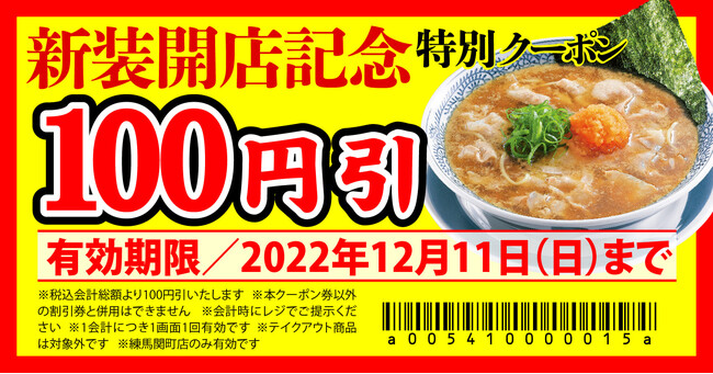 リニューアル記念として、2022年12月11日(日)まで『丸源ラーメン 練馬関町店』のみでご利用いただける100円引クーポンを配布します。